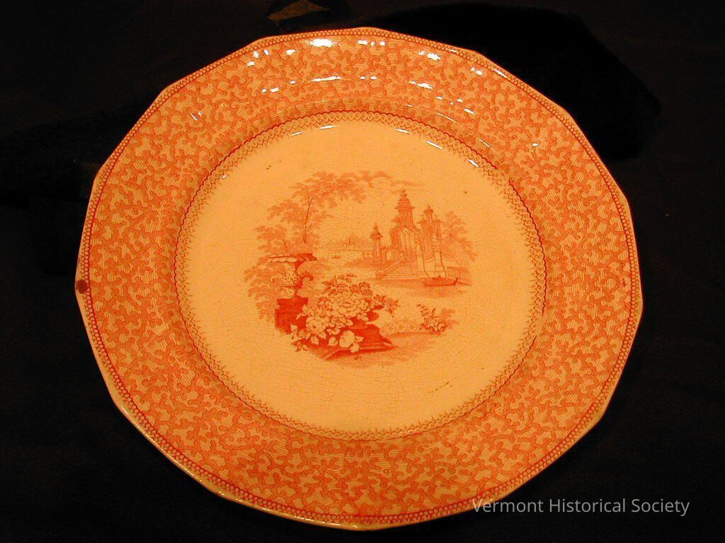 Red-and-white transfer-printed plate. The center is printed with a scenic design showing an urn and a bouquet of flowers at the side of the river with a castle on the opposite shore. The rim is printed with a coral design. The back is marked, "Marino / G. PHILLIPS / LONGPORT".