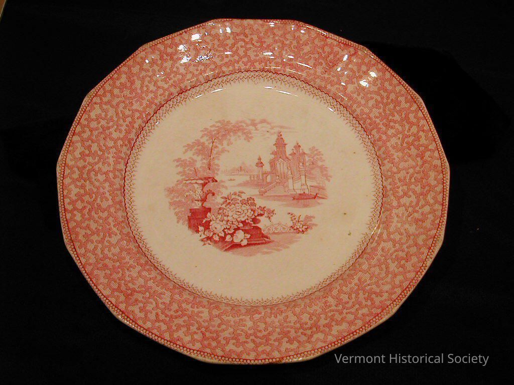 Red-and-white transfer-printed plate. The center is printed with a scenic design showing an urn and a bouquet of flowers at the side of the river with a castle on the opposite shore. The rim is printed with a coral design. The back is marked, "Marino / G. PHILLIPS / LONGPORT".