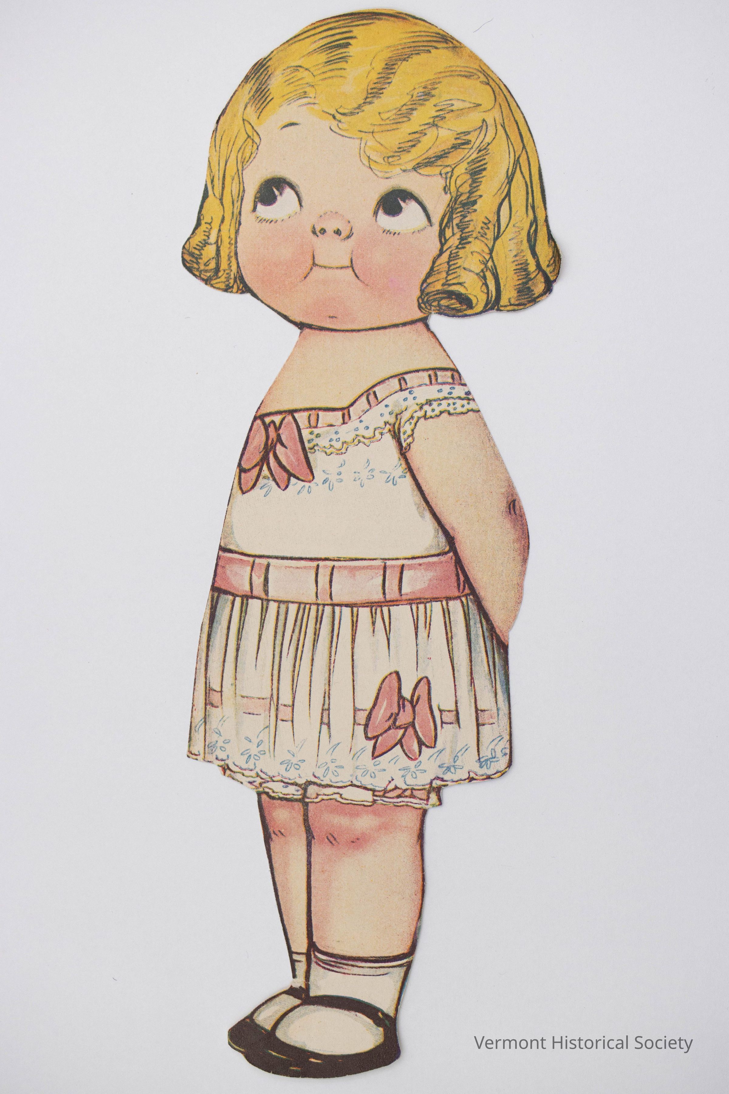 Small paper doll. The doll depicts a young child with yellow hair and pink skin wearing a white dress undergarment, white socks, and black shoes. The back shows a portion of a magazine page and the handwritten label, "Elizabeth Satan".Context