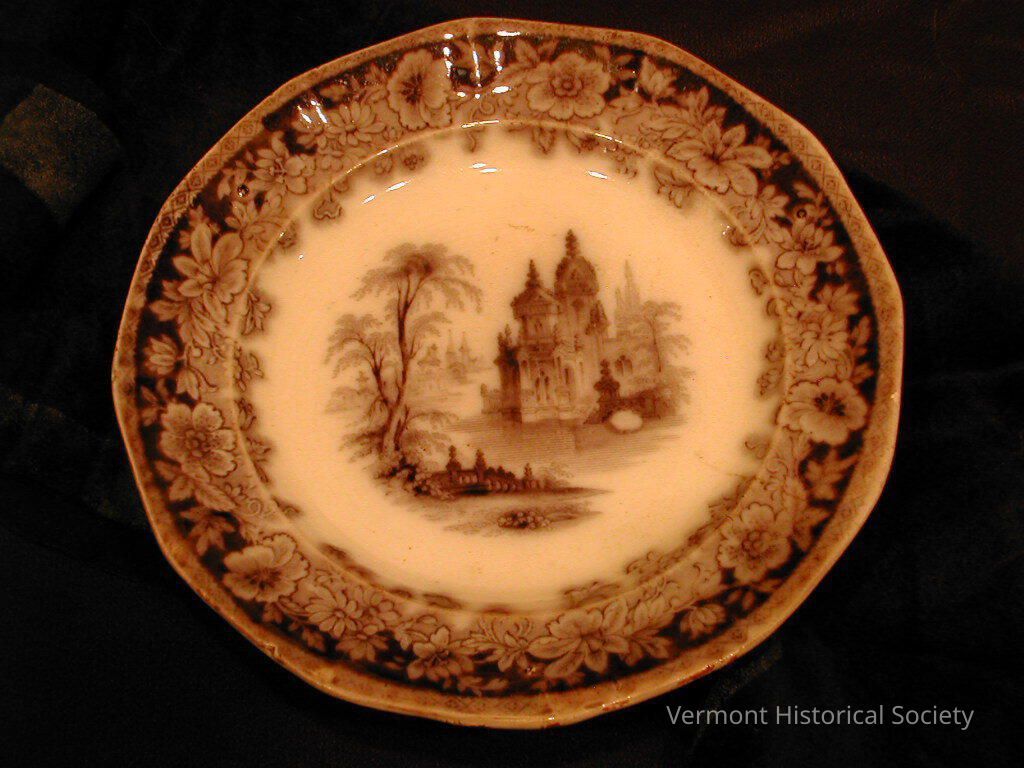 Black-and-white transfer-printed plate. The center is printed with a scenic design showing a river with a fenced landscape in the foreground and a palace on the far shore. The rim is printed with flowers. The back is marked, "LEIPSIC".