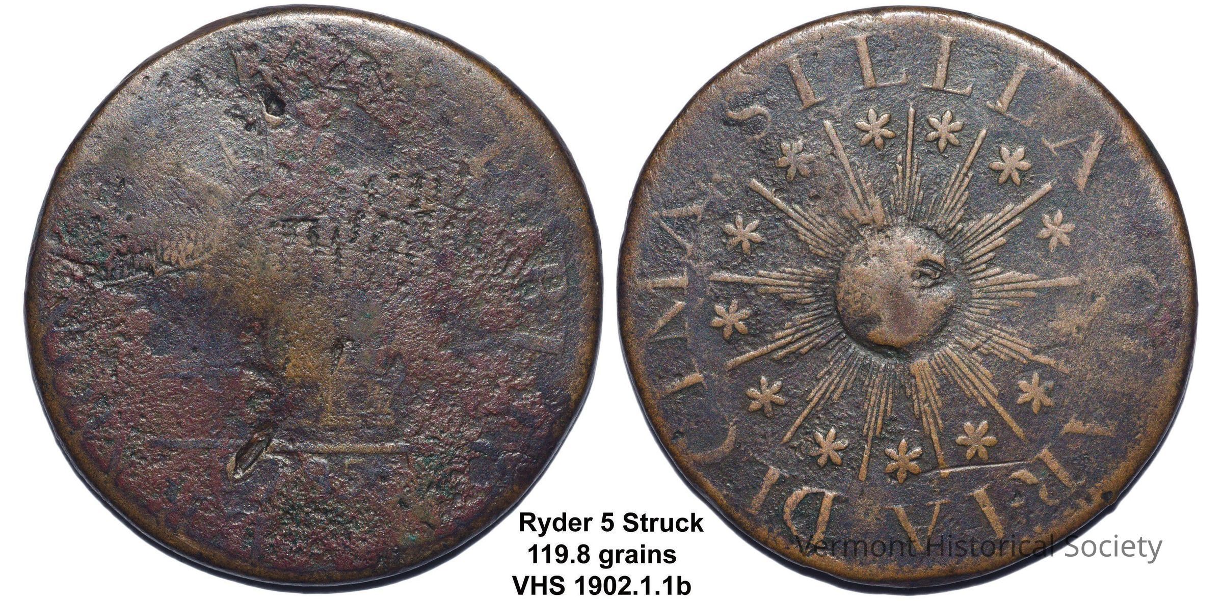 Copper coin with a radiating eye on one side and a pictorial scene on the other. The eye side shows a detailed human eye with 13 rays emitting from it in every direction. Between each ray is a 6-petaled flower (13 in total). The words, "STELLA QUARTA DECIMA" ring the edge. The reverse shows a scene of a plow in a field with a line of hills and trees on the horizon. A sun with two eyes and a prominent nose peeks over the horizon. The words "VERMONTIS RES PUBLICA" ring the edge.