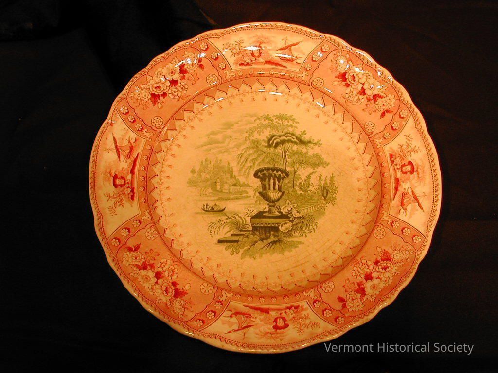 Transfer-printed plate with a green center and red border. The center shows a large urn at the side of a body of water, with a boat in the distance. The border is separated into wedges, alternating between floral bunches and a scene with an urn and a sailboat. The back is marked, "CANOVA".