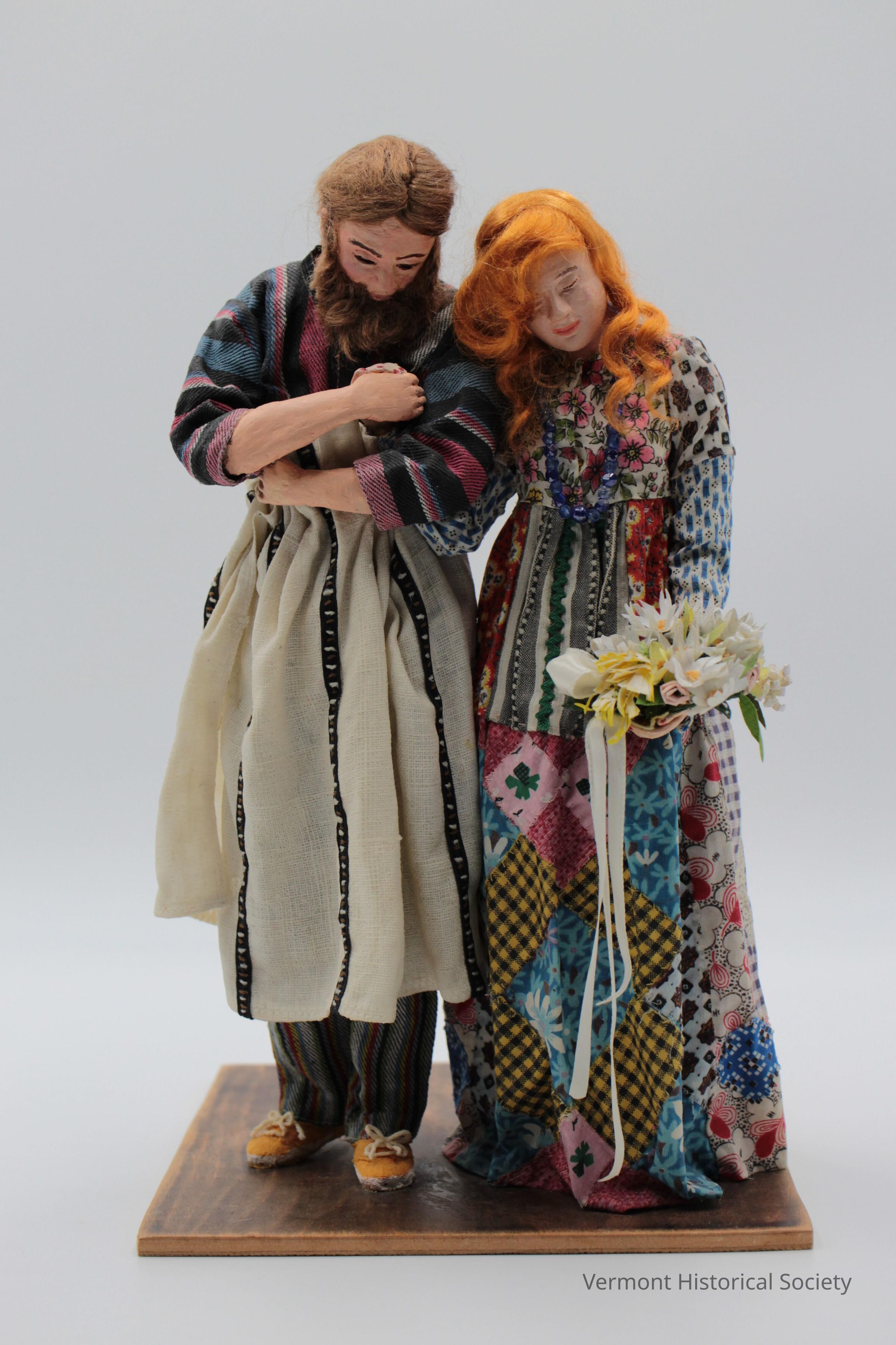 Scenic papier-mâché figure with two people, a man and a woman, getting married. The man has long brown hair held in a ponytail and a beard. He is wearing a thick, striped shirt, brown tennis shoes, and a white skirt over striped pants. The woman has curly orange hair and is wearing a patchwork floor-length dress with a long beaded necklace. She is holding a bouquet of paper flowers.