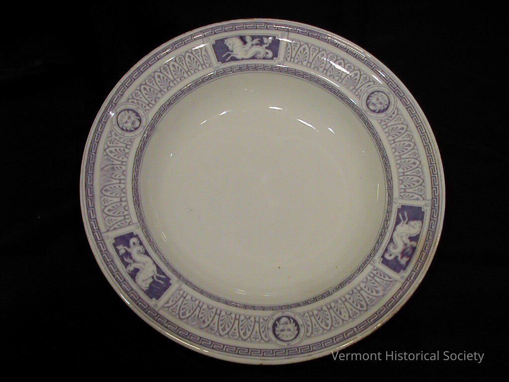 Purple-and-white transfer-printed soup plate. The rim is printed with a classical architectural design of acanthus leaves with three rectangular cartouches showing hippocampus alternating with three round cartouches showing faces.