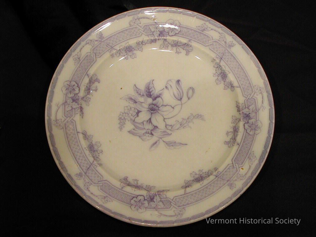 Purple-and-white transfer-printed plate. The plate is printed with a design of garden flowers. The rim is printed with a lattice design. The back is marked, "AMERILLIA".