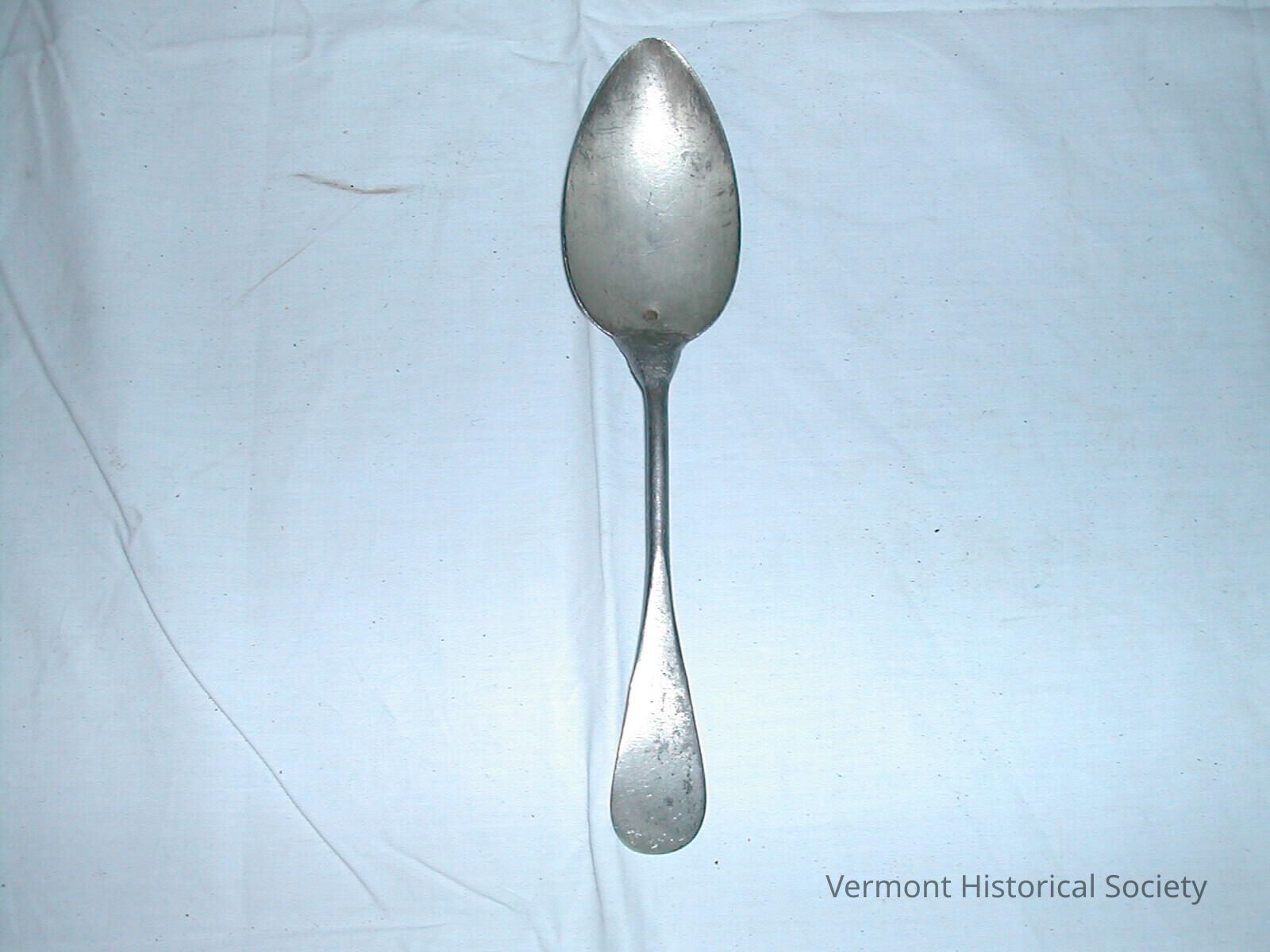 Tin spoon with rat tail handle. The back of the handle is inscribed with the label, "T. B. Walter/Co. E Vt. Vol." The mark, "Pat Oct 27 & Sept 2[illeg] 58" is stamped on the reverse. The spoon had been repaired where handle meets bowl.Context