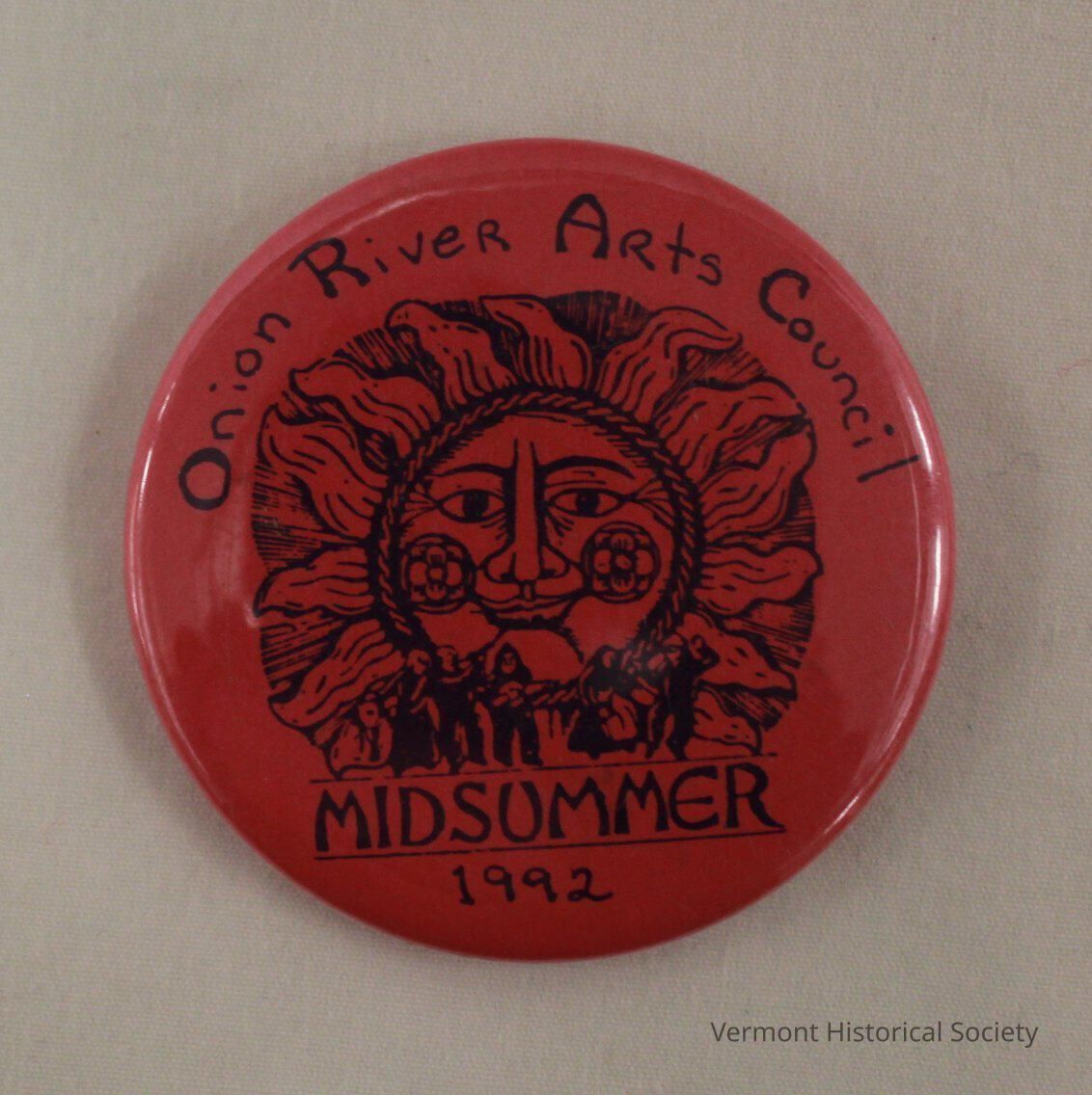 Metal pink button. The center of the button has a smiling face sun with people standing facing the sun. "Onion River Arts Council" is written along the top of the button, and "MIDSUMMER / 1992" under the people on the bottom of the pin.Context