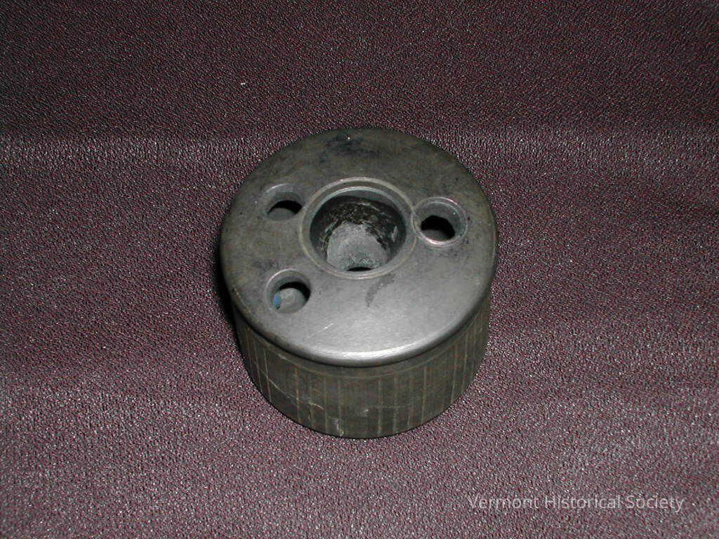 Round, soapstone inkwell. The top has three small holes around a large, central hole. The sides are scribed with vertical lines.