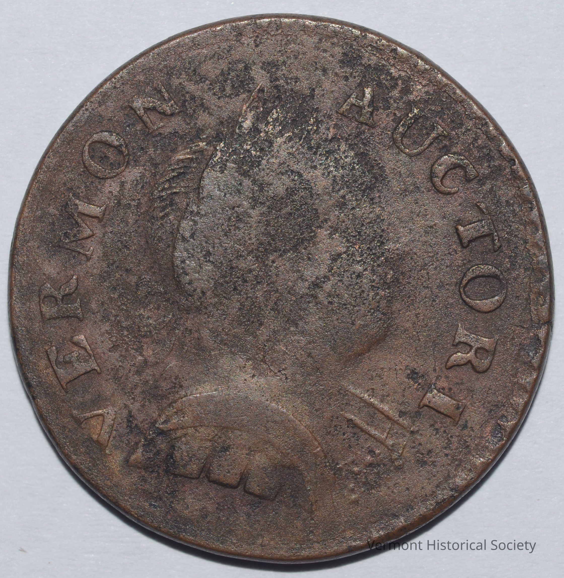 Copper coin with a bust on one side and the allegorical figure, Columbia, on the other. The face side shows a right-facing bust of a Roman figure, wearing a laurel wreath on his head, tied with a ribbon at the nape of his neck, and military armor. The words "VERMON AUCTORI" ring the edge. On the reverse, Columbia is shown swathed in loose fabric, seated next to a shield bearing the Union flag. She is holding a staff with a liberty cap in her left hand, and a small branch in her right hand. The date 1787 is at the bottom center.Context