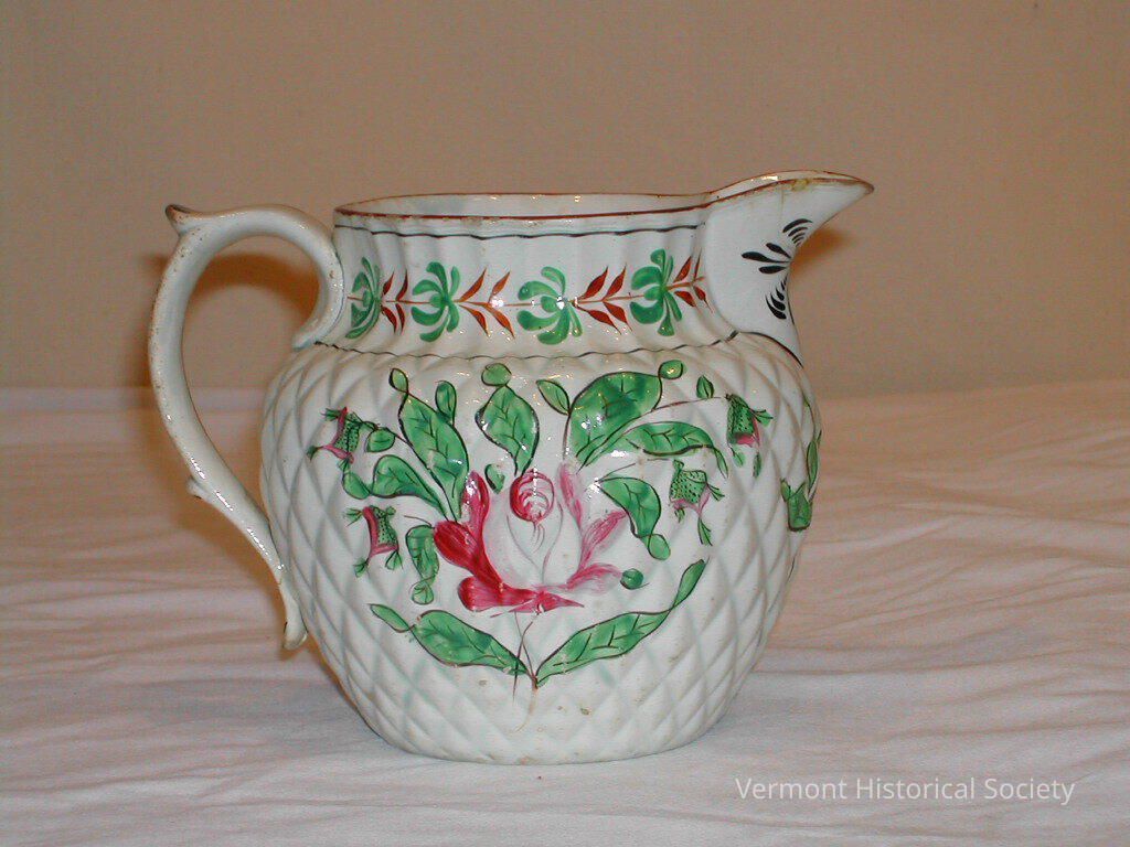 White-bodied ceramic pitcher with multicolored hand-painted decoration. The pitcher is molded with a repeating diaper pattern and fluted near the rim. It is painted (underglaze) with a design of roses, rosebuds, and leaves on the body, and red and green leaves around the rim. The handle and top edge are gilded.
