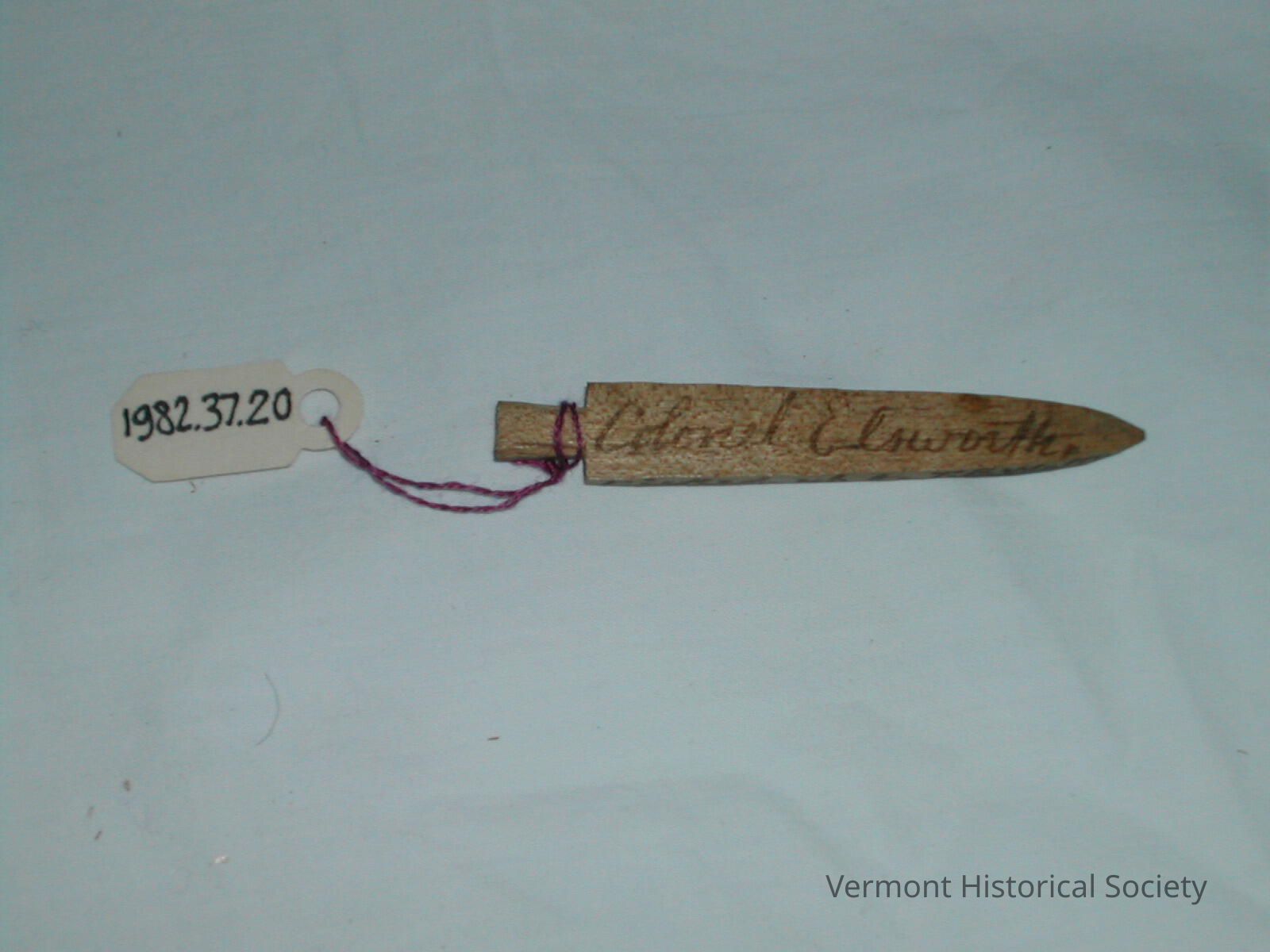 Small wooden memento shaped like a knife. One side has the written inscription, "Colonel Elsworth", and the other has "Colonel Elsworth/City of Alexandria Va".Context