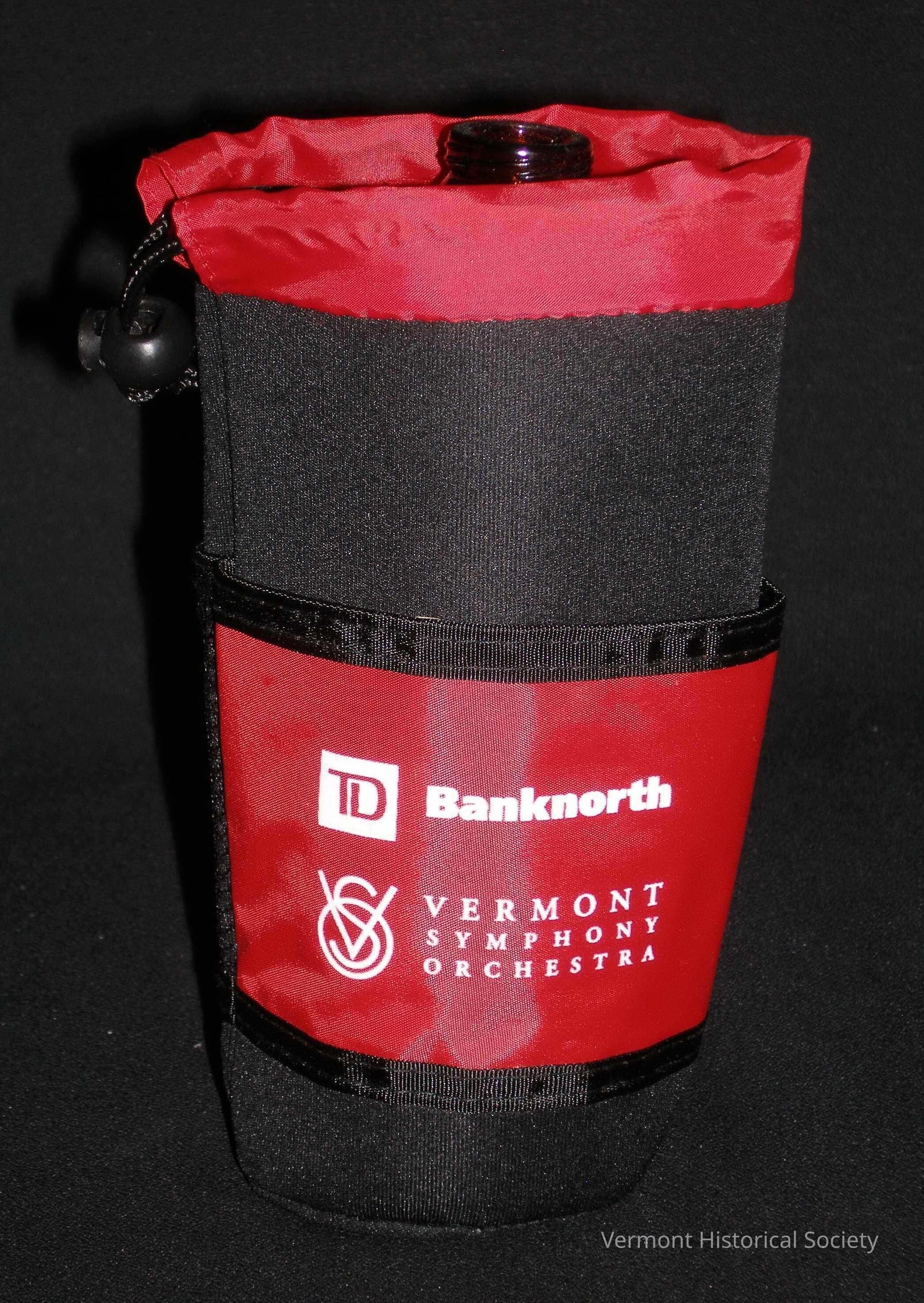 Black foam insulated beverage holder (drink coozie) with a drawstring top. There is a red nylon pocket on one side printed in white with the logos for TD Banknorth and Vermont Symphony Orchestra. There is a black net pocket on the other side, and a plastic clip for attaching the holder to a strap.