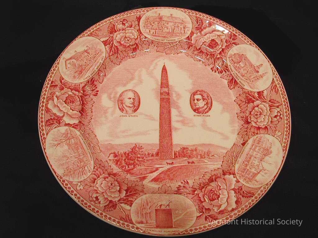 Red-and-white transfer printed plate showing the Bennington Monument at the center. The monument is shown as part of a landscape scene, with the surrounding park at the bottom. Flanking the monument are portrait busts of John Stark and Ethan Allen. The border has large cabbage roses interspersed with oval-framed Bennington scenes. The back is labeled with the inscription, "Bennington Battle Monument Erected 1867-1881 "There are the redcoats; they are ours, or Molly Stark sleeps a widow to night." Gen: John Stark. At Battle of Bennington, Aug: 16th 1777." It also bears a Wedgwood maker's mark and the label, "Made in England for C. F. Atkins, Bennington, Vermont."