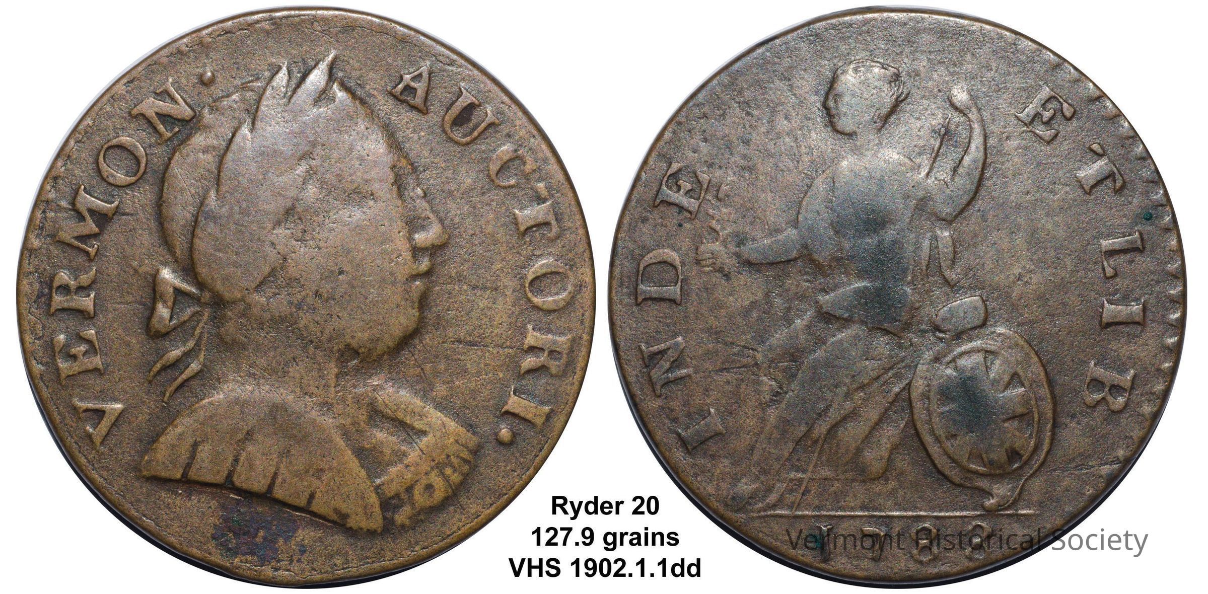 Copper coin with a bust on one side and the allegorical figure, Columbia, on the other. The face side shows a right-facing bust of a Roman figure, wearing a laurel wreath on his head, tied with a ribbon at the nape of his neck, and military armor. The words "VERMON AUCTORI" ring the edge. On the reverse, Columbia is shown swathed in loose fabric, seated next to a shield bearing the Union flag. She is holding a staff with a liberty cap in her left hand, and a small branch in her right hand. The date 1788 is at the bottom center.Context