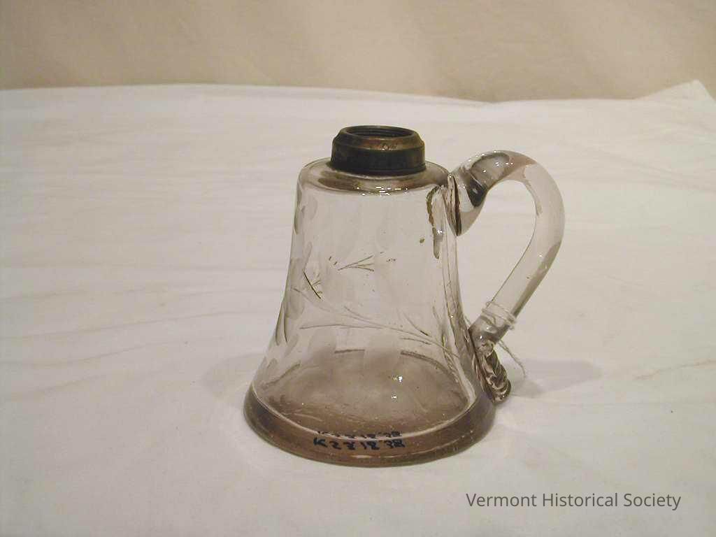 Glass base for an oil lamp with a handle. The glass is etched with a design of flowers and leaves.