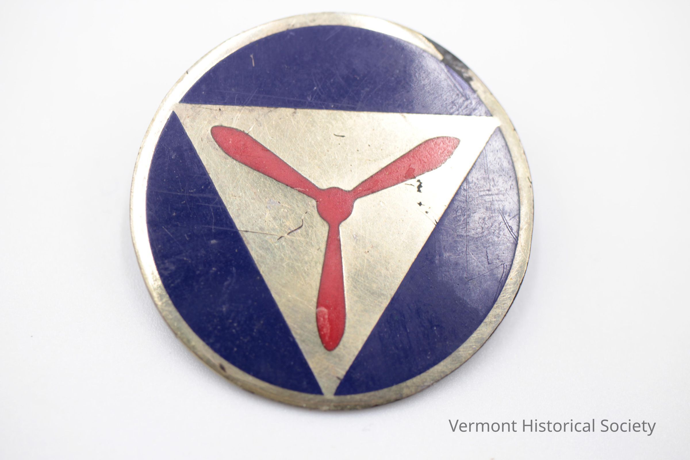 A silver rimmed, blue pin with the symbol of the Civil Air Patrol -- a silver triangle with a red propeller inside.