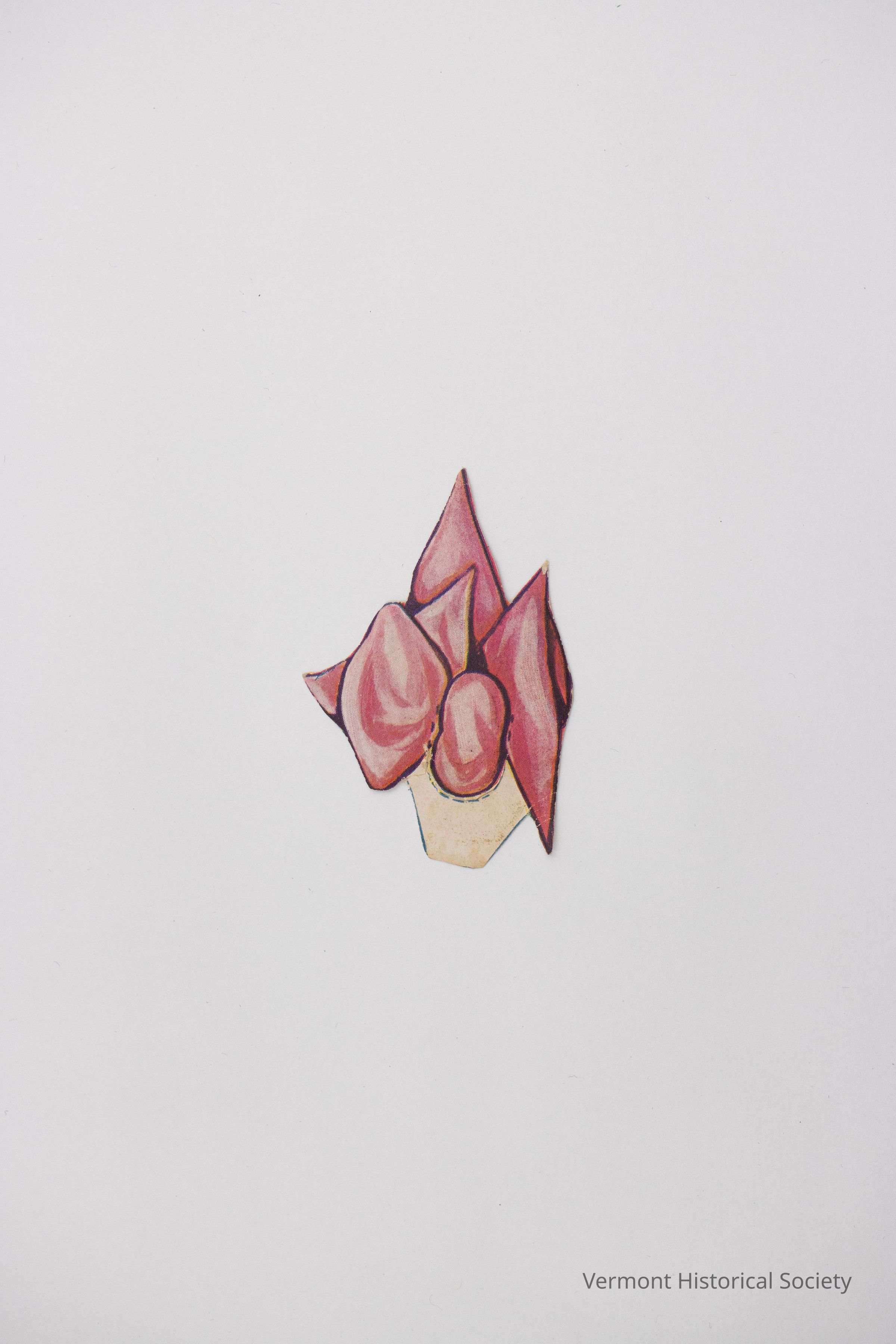 Pink, printed paper hair bow for a paper doll. There is a tab at the bottom for inserting behind the doll's head. The back shows a portion of a sales catalog page.Context