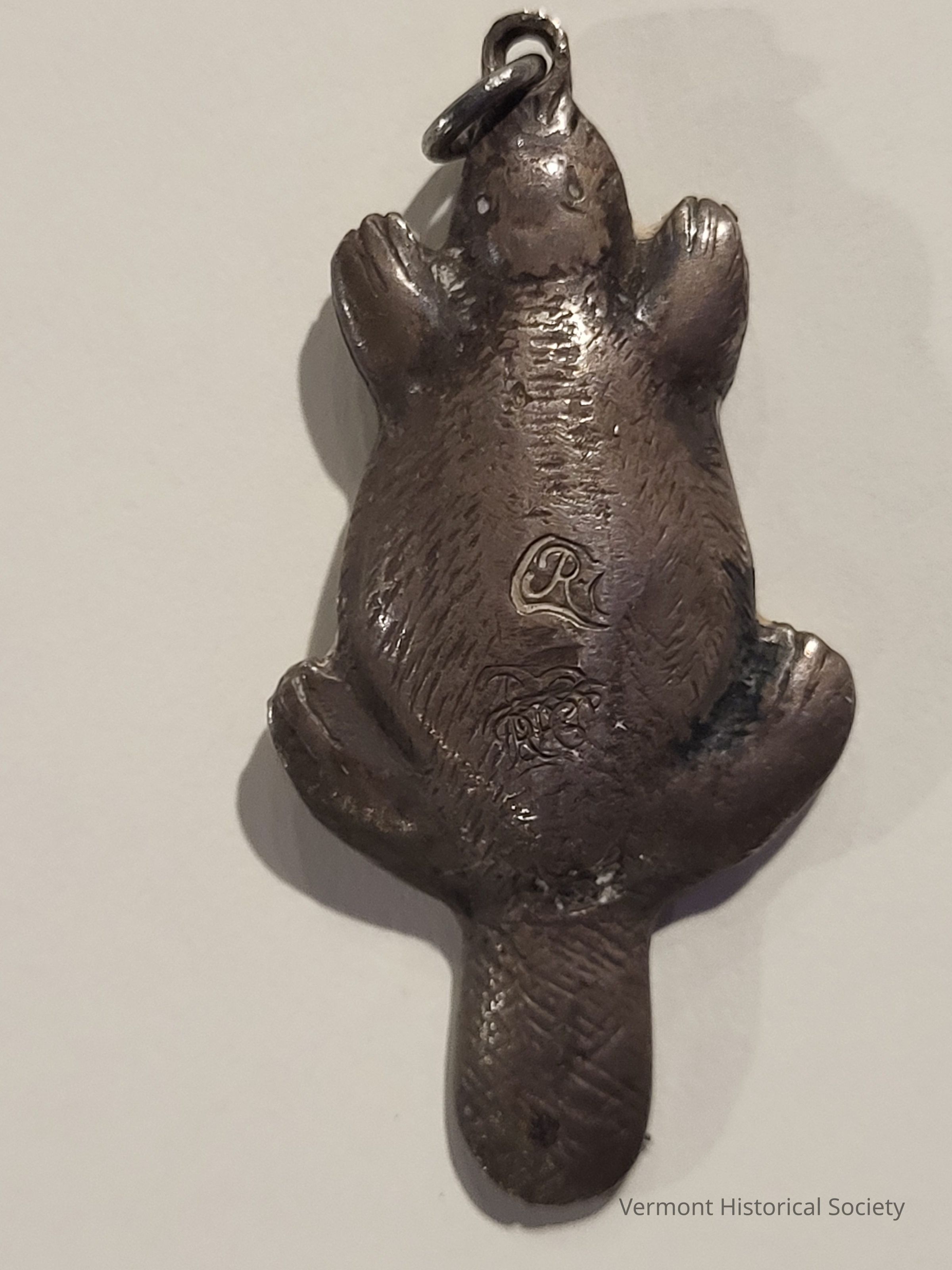 Beaver-shaped silver pendant. The pendant has a hole punched at the tip of the nose with a ring affixed for hanging. The metal is slightly textured to evoke fur and four webbed feet. The rounded back is stamped "R" in cursive in a square with an over-stamped mark below it that reads "RC" with other letters and scrollwork.