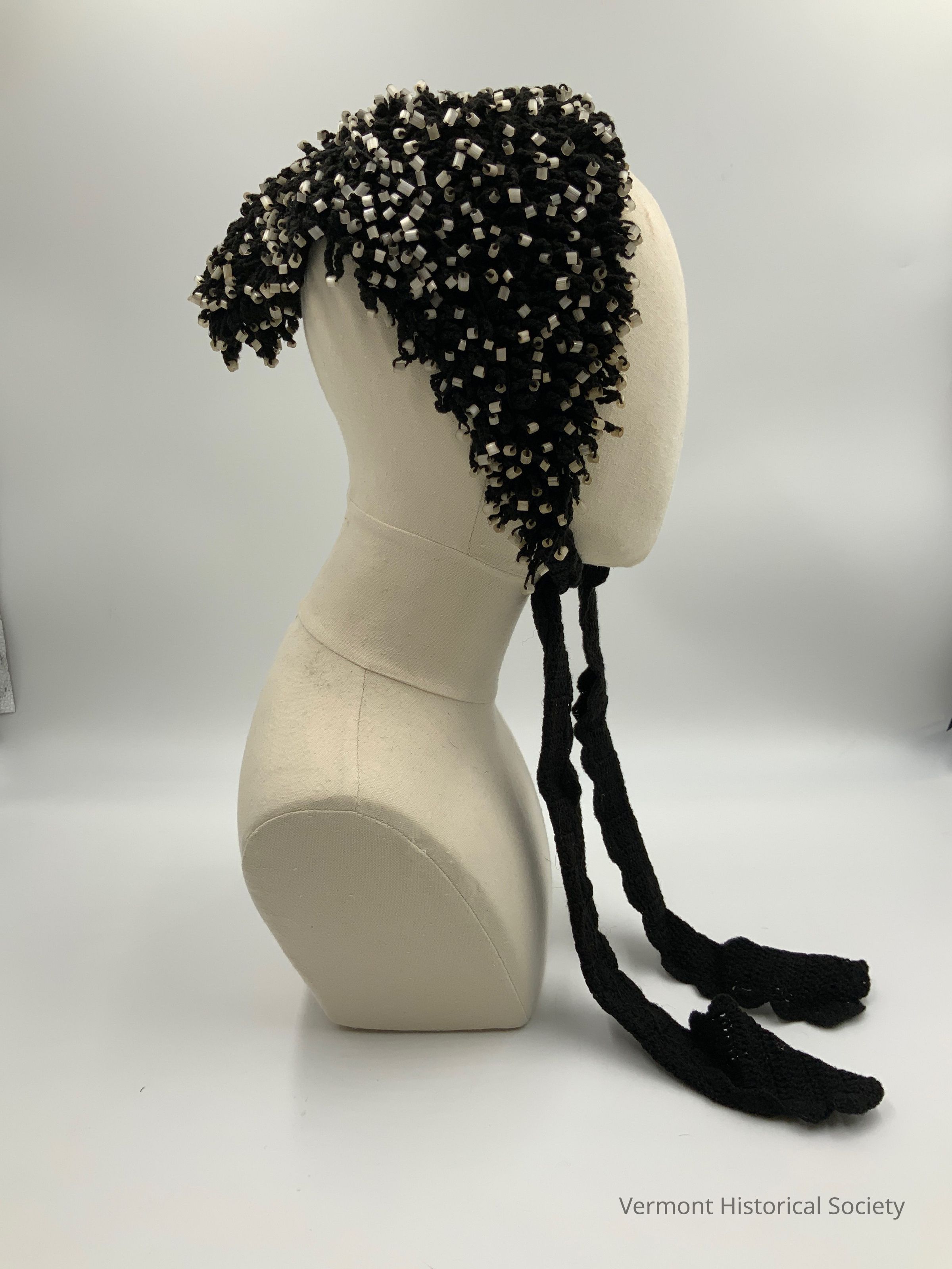 Triangular crocheted wool headscarf decorated with white glass beads. The scarf is crocheted in loops, creating a pile. There crocheted ties at two of the points that tie beneath the wearer's chin.