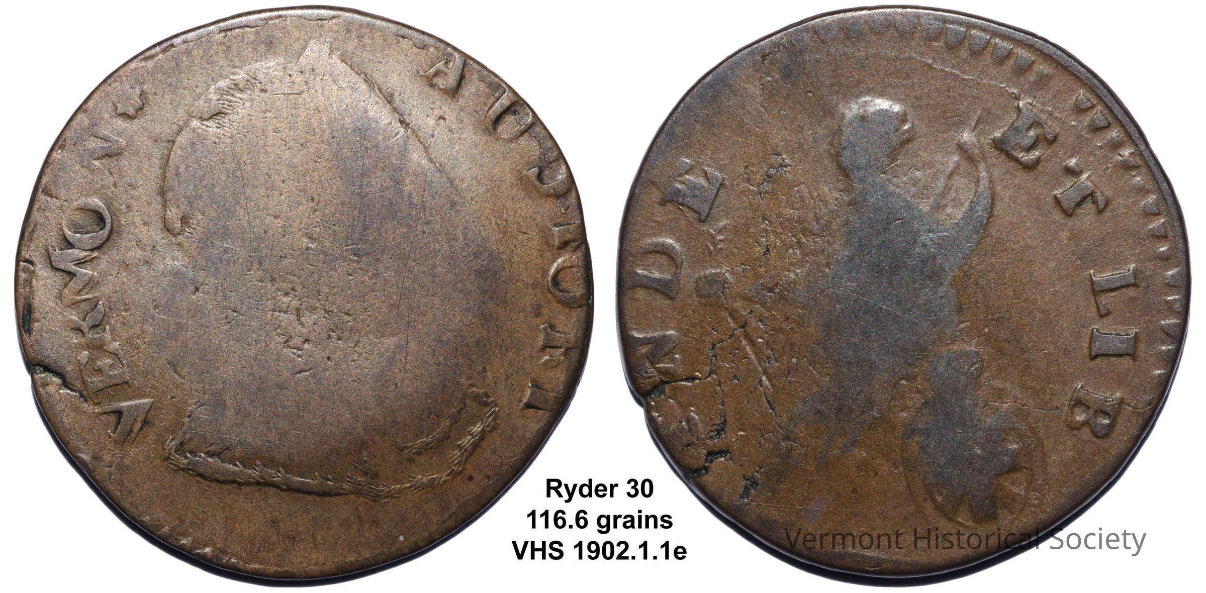 Copper coin with a bust on one side and the allegorical figure, Columbia, on the other. The face side shows a right-facing bust of a Roman figure, wearing a laurel wreath on his head, tied with a ribbon at the nape of his neck, and military armor. The bust is so rubbed smooth that it is hardly visible. The words "VERMON AUCTORI" ring the edge. The O in "Vermon" is mis-struck, overlapping the M slightly. On the reverse, Columbia is shown swathed in loose fabric, seated next to a shield bearing the Union flag. She is holding a staff with a liberty cap in her left hand, and a small branch in her right hand.Context