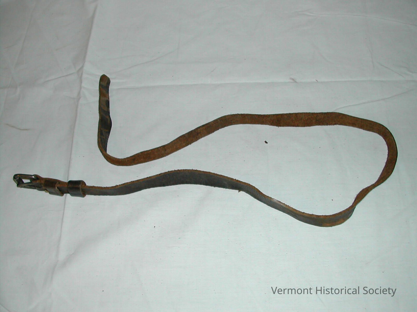 Brown leather strap with a metal buckle at one end. The other end is incised with the inscription, "TW c E".Context