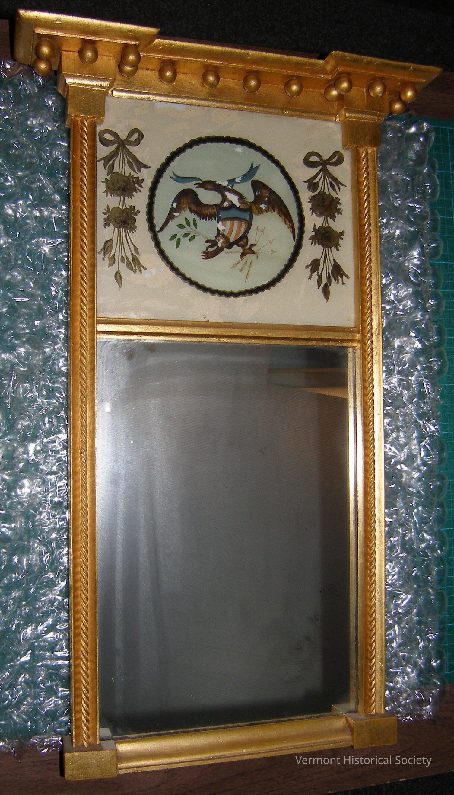 The wall mirror has a wooden frame painted in gold. It is divided into two parts - the top portion has a 'reverse painting' while the bottom is a mirror. The central part of the top portion features an eagle that is approximately 6 inches in diameter. On either side of the eagle, there is a gold 'bow' with roses and buds hanging down from it.