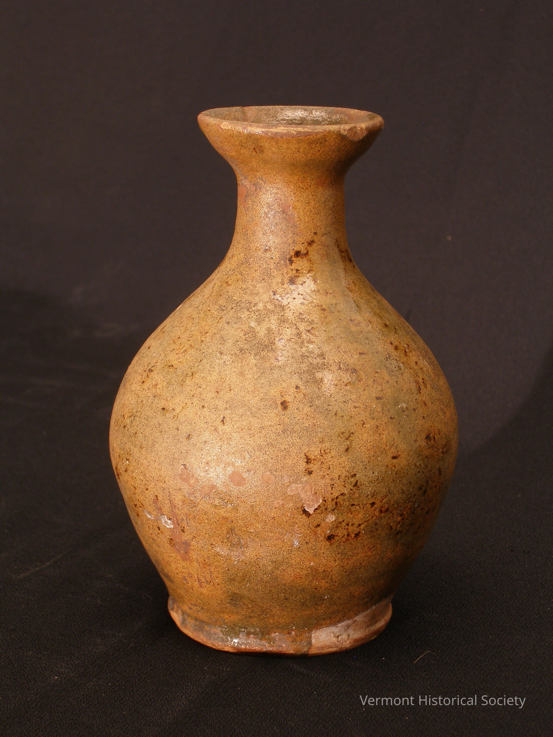 Ceramic vase with a mottled green, brown, and red glaze over a red ceramic body.