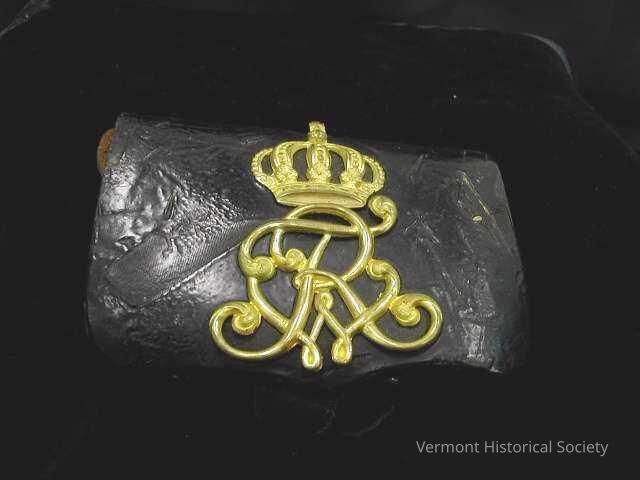 Black leather cartridge box that secures with a flap that covers the front of the case. On the flap is a large brass emblem in the shape of a crown over the entwined initials RTW.