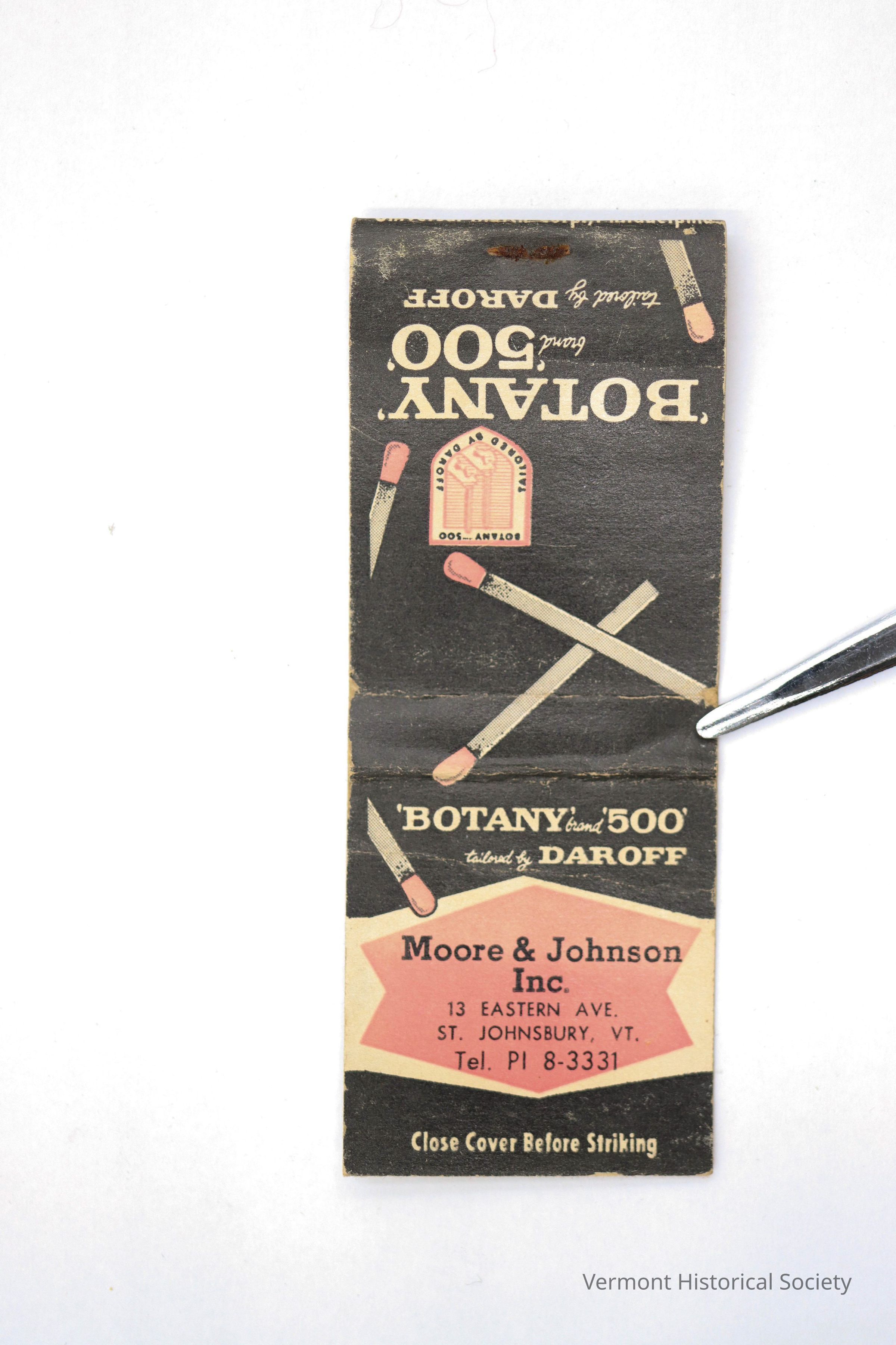 Black cardboard bifold matchbook. The front flap is printed with the inscription, "Moore & Johnson Inc. 13 EASTERN AVE. ST. JOHNSBURY, VT. Tel Pl 8-3331"