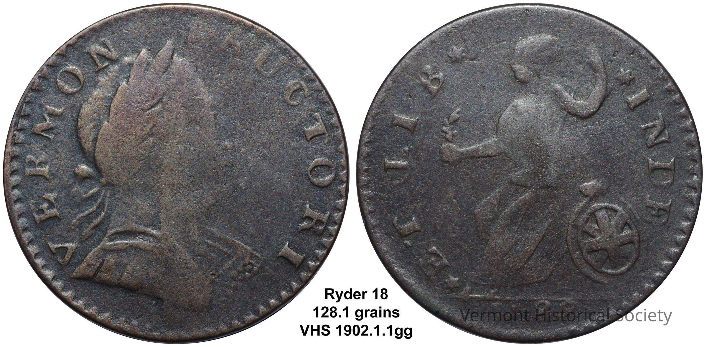 Copper coin with a bust on one side and the allegorical figure, Columbia, on the other. The face side shows a right-facing bust of a Roman figure, wearing a laurel wreath on his head, tied with a ribbon at the nape of his neck, and military armor. The words "VERMON AUCTORI" ring the edge. A line runs down the center of the coin where the striking die had broken. On the reverse, Columbia is shown swathed in loose fabric, seated next to a shield bearing the Union flag. She is holding a staff with a liberty cap in her left hand, and a small branch in her right hand.Context
