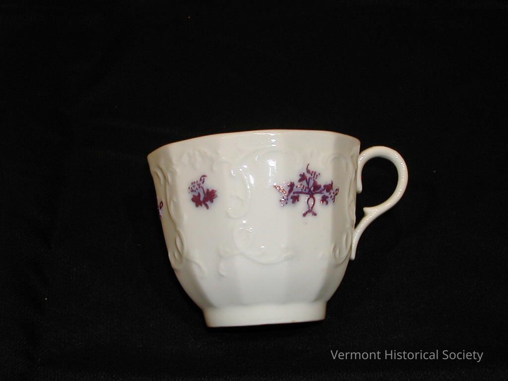 White-bodied ceramic teacup with molded and lustered design. The body of the cup is faceted and molded with curvilinear rococo swashes and floral sprigs. The floral sprigs are painted with purple luster. The handle is round.