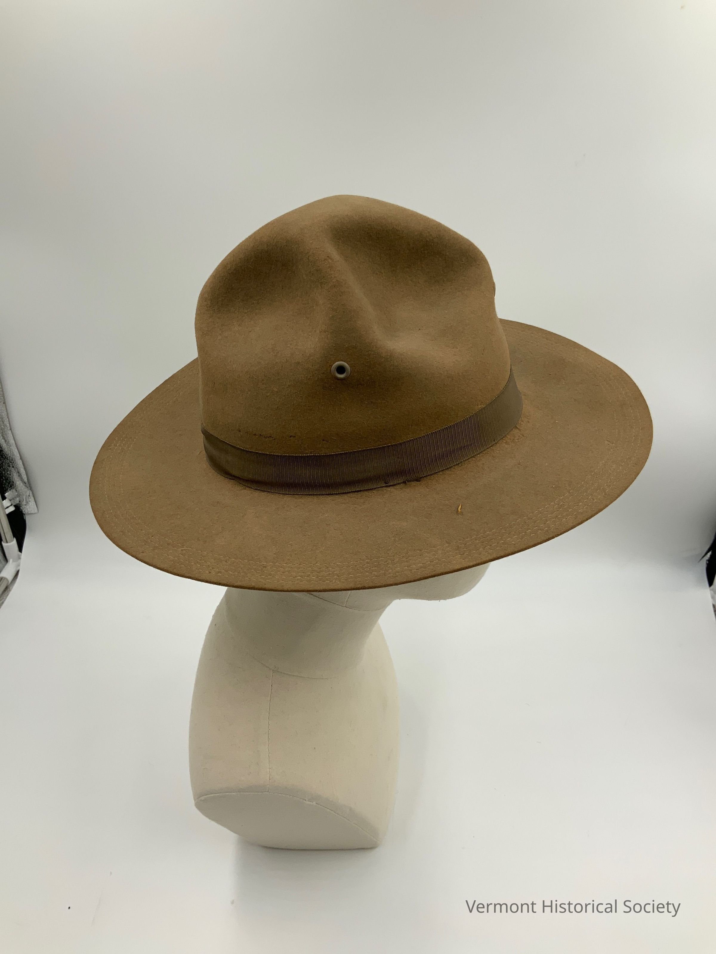 Brown wool campaign hat. The hat has a wide, slightly downturned brim. The round crown is indented in four quadrants. There is a brown grosgrain ribbon around the base of the crown.