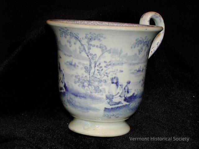 Small blue & white teacup with a high handle and flared lid. The blue-and-white transfer-printed design shows figures having a picnic in a meadow overlooking a lake.