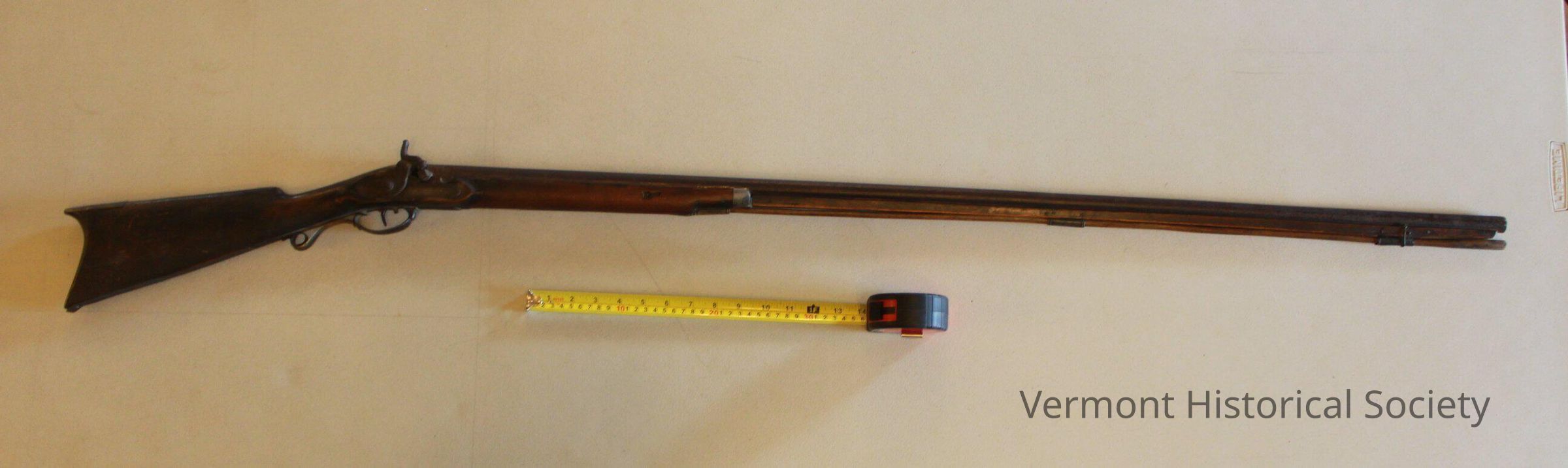 Muzzle-loading shotgun or musket. The percussion lock is marked, "Joseph Golcher" and simply engraved with floral sprigs. The barrel has the partial mark, "DON".