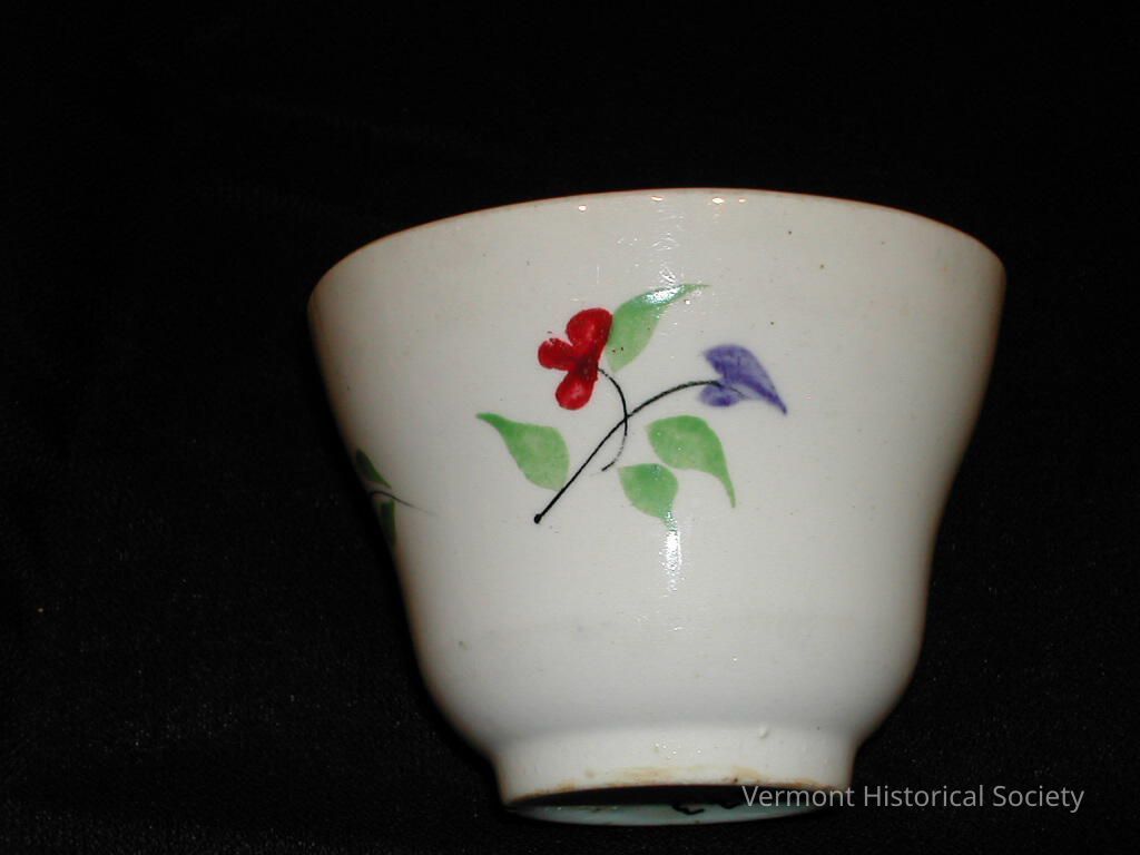 White teacup or tea bowl with no handle. The cup is decorated with hand-painted sprigs of flowers in red and purple on both the exterior and interior of the cup.