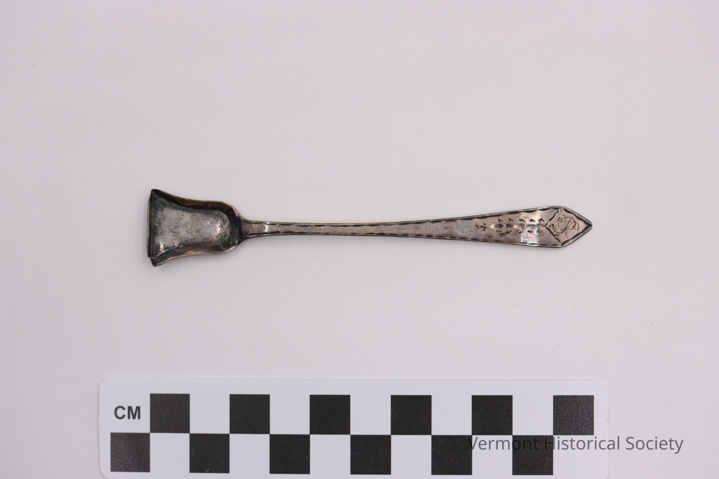 Sugar spoon with a shovel-shaped bowl. The front of the handle is engraved with the initial P and a simple vine design. The back of the handle is not marked.
