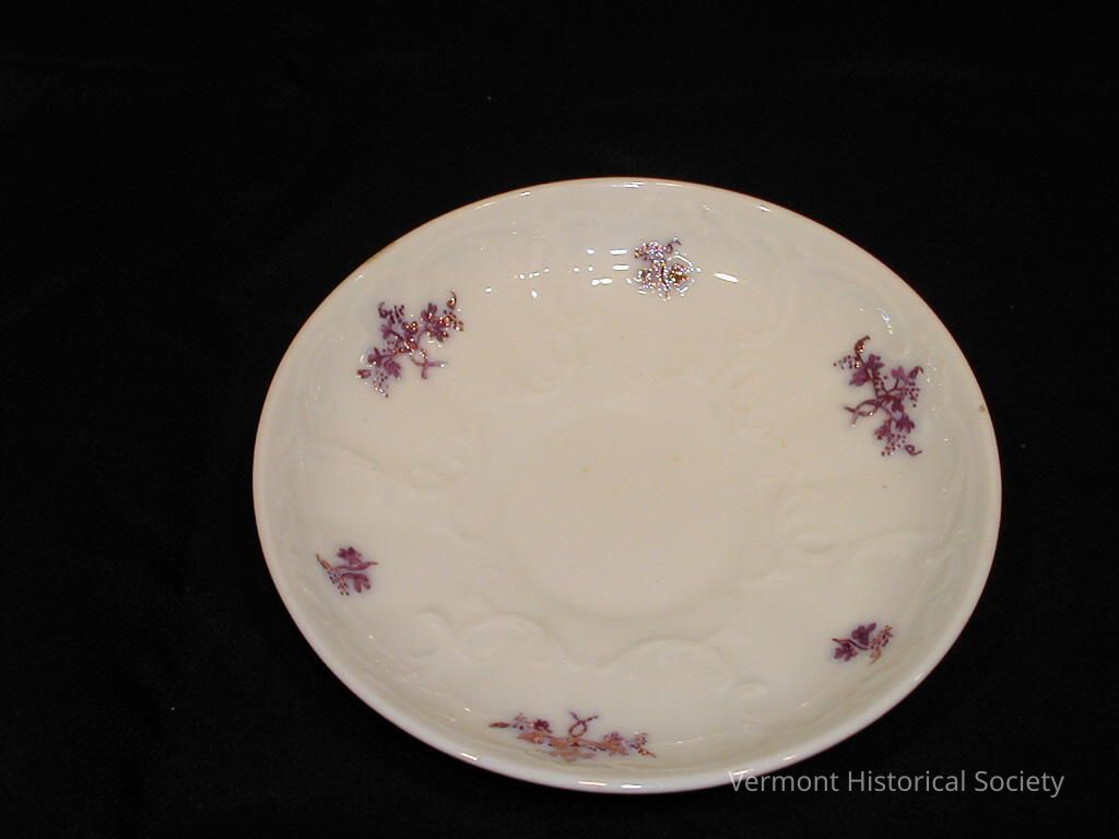 White-bodied ceramic saucer with molded and lustered design. The body of the saucer is molded with curvilinear rococo swashes and floral sprigs. The floral sprigs are painted with purple luster.