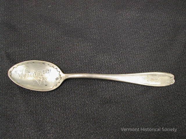 Souvenir spoon with the words, "Windsor VT" engraved within the bowl. The rim of the bowl is engraved with a curvy line.