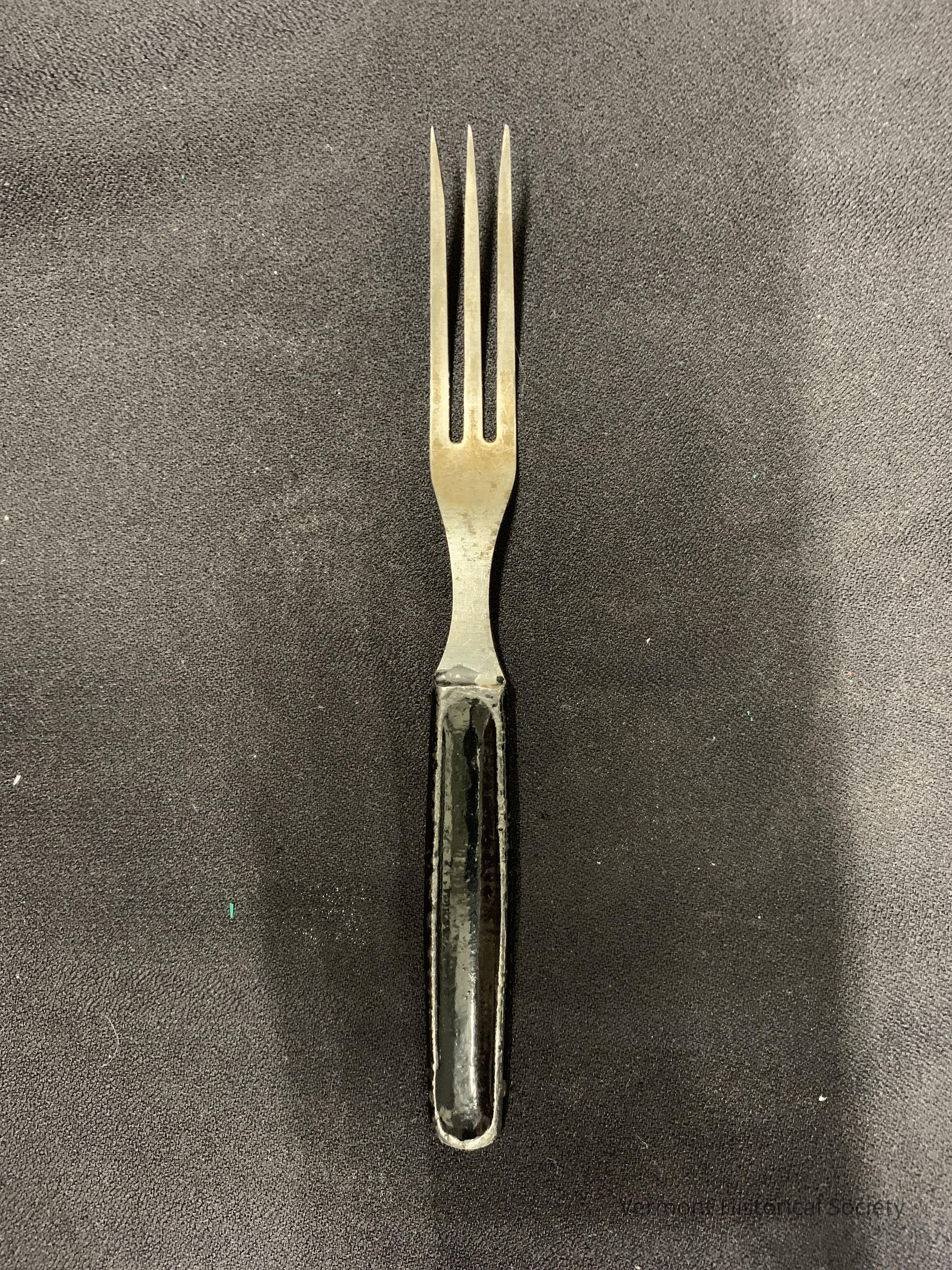 Three-tined metal fork made of a single piece of metal. The neck, or tang, of the fork is stamped, "U.S." just before the handle. The handle is painted black and scratched with "Howes".
