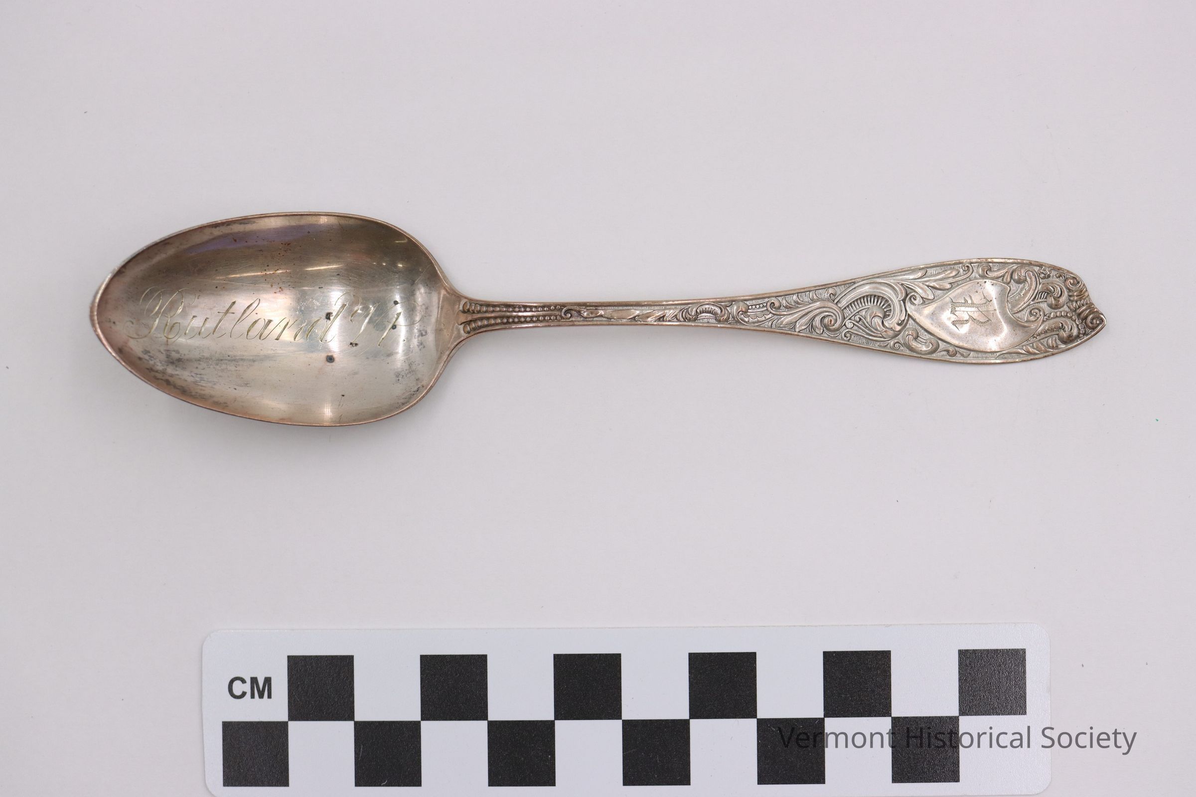 Silver souvenir demitasse spoon. The bowl of the spoon is engraved with the words, "Rutland Vt." The handle is heavily chased in a floral pattern. There is a cartouche at the end of the handle engraved with the letter R in gothic script. The back of the handle is marked with "RW&S" in gothic script followed by the word "STERLING."