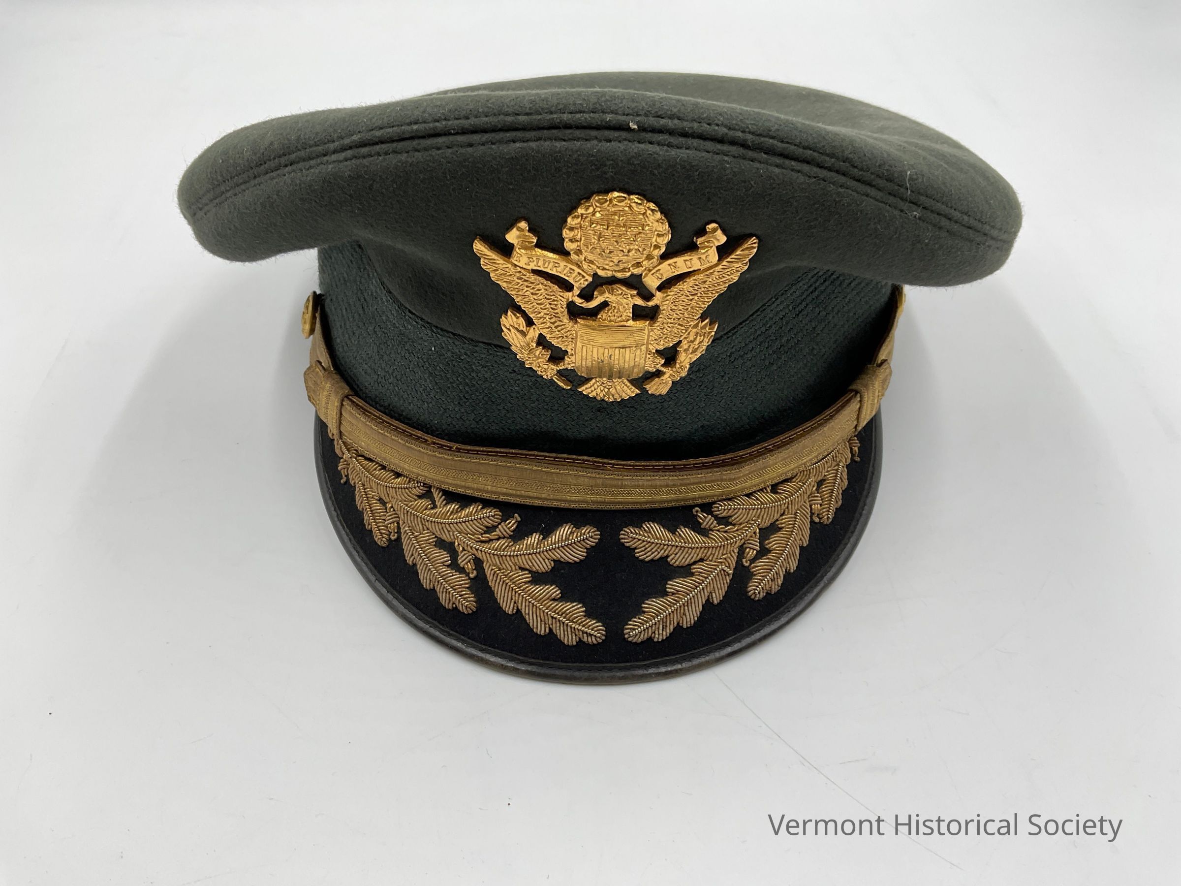 This hat was worn by Lawrence Rossi (1918-2025) of Barre during military service. He spent three years in the Pacific Theater during WWII, serving as a 1st Lieutenant with the Army's 172nd Infantry. After he was discharged in 1946 he continued to serve in the Vermont National Guard and was reactivated to serve in the Korean War. He retired as a Major from the Vermont National Guard in 1963.