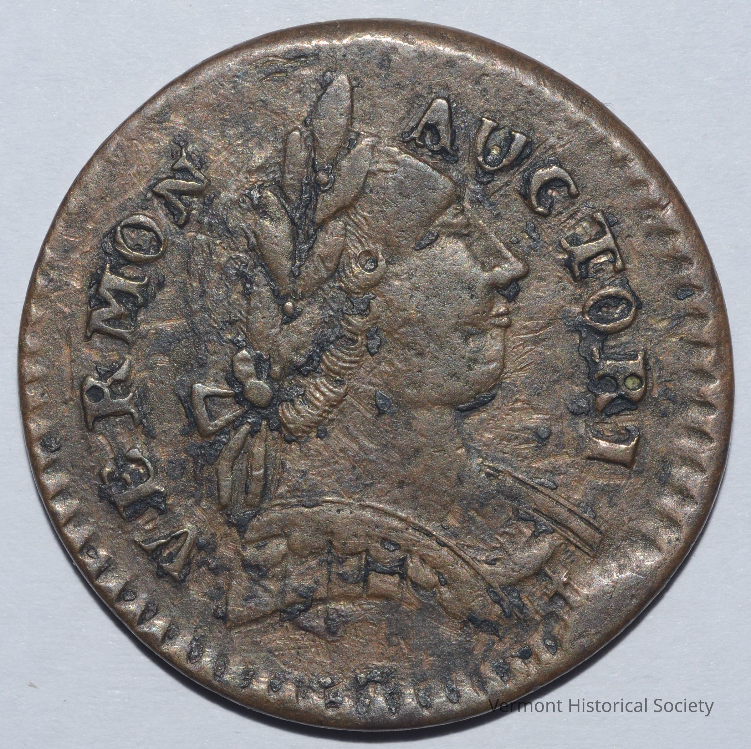 Copper coin with a bust on one side and the allegorical figure, Columbia, on the other. The face side shows a right-facing bust of a Roman figure, wearing a laurel wreath on his head, tied with a ribbon at the nape of his neck, and military armor. The words "VERMON AUCTORI" ring the edge. On the reverse, Columbia is shown swathed in loose fabric, seated next to a shield bearing the Union flag. She is holding a staff with a liberty cap in her left hand, and a small branch in her right hand. The surface of the coin is unusual, indicating that it may be cast, overstruck, or doublestruck.Context