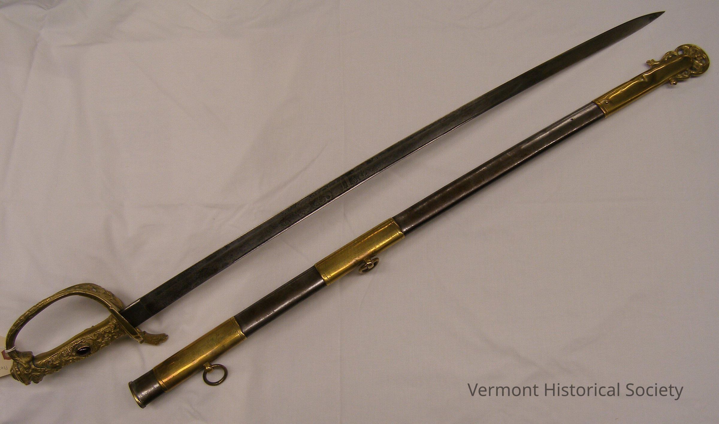 Presentation sword and scabbard. The sword has a molded brass grip, guard, and pommel, decorated with scrollwork, a man in a toga, an eagles head, and a large red gem. The uppermost brass mount on the scabbard is engraved, "Presented to Capt. M. H. Twitchell at City Point V.a April 1865", along with the names of several Civil War battles.Context
