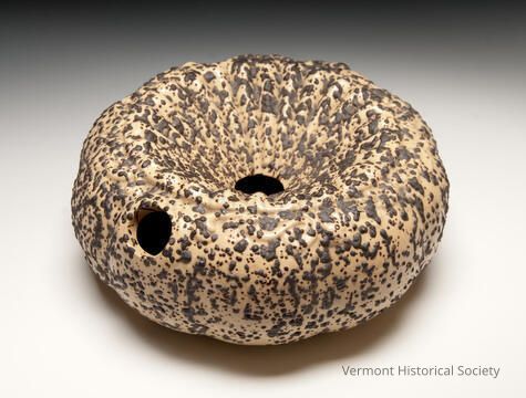 Round ceramic spittoon. The spittoon is unglazed and decorated with a dark, splattered ceramic that retains definition, causing a raised effect. The spittoon sloped down at the top to a central hole, and the sloped section is fluted. There is a round drainage hole on one end.