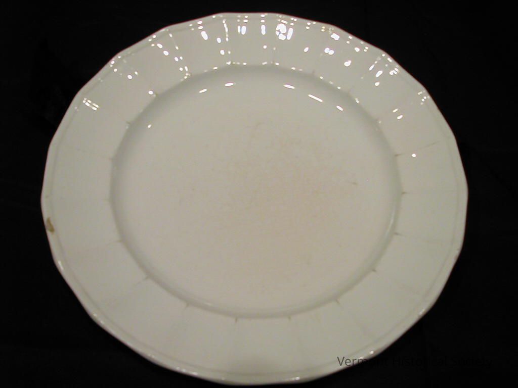 White ceramic plate with a wide, fluted border. The revers is marked, "Ironstone China, pearl, J. Wedgewood".