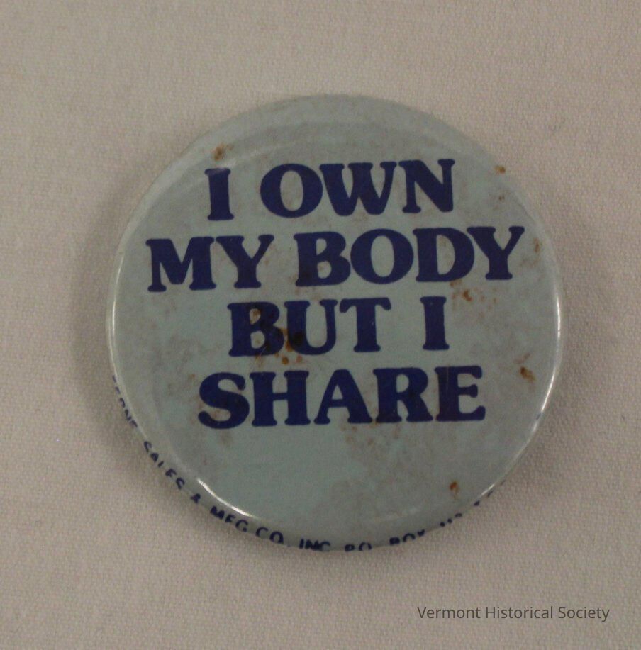 Metal and plastic political button. The button is white with blue lettering that says “I OWN / MY BODY / BUT I / SHARE” and has some reddish discolored sections. The edges of the pin have the words “FERNES SALES & MFG CO. INC” and the address in blue lettering.Context