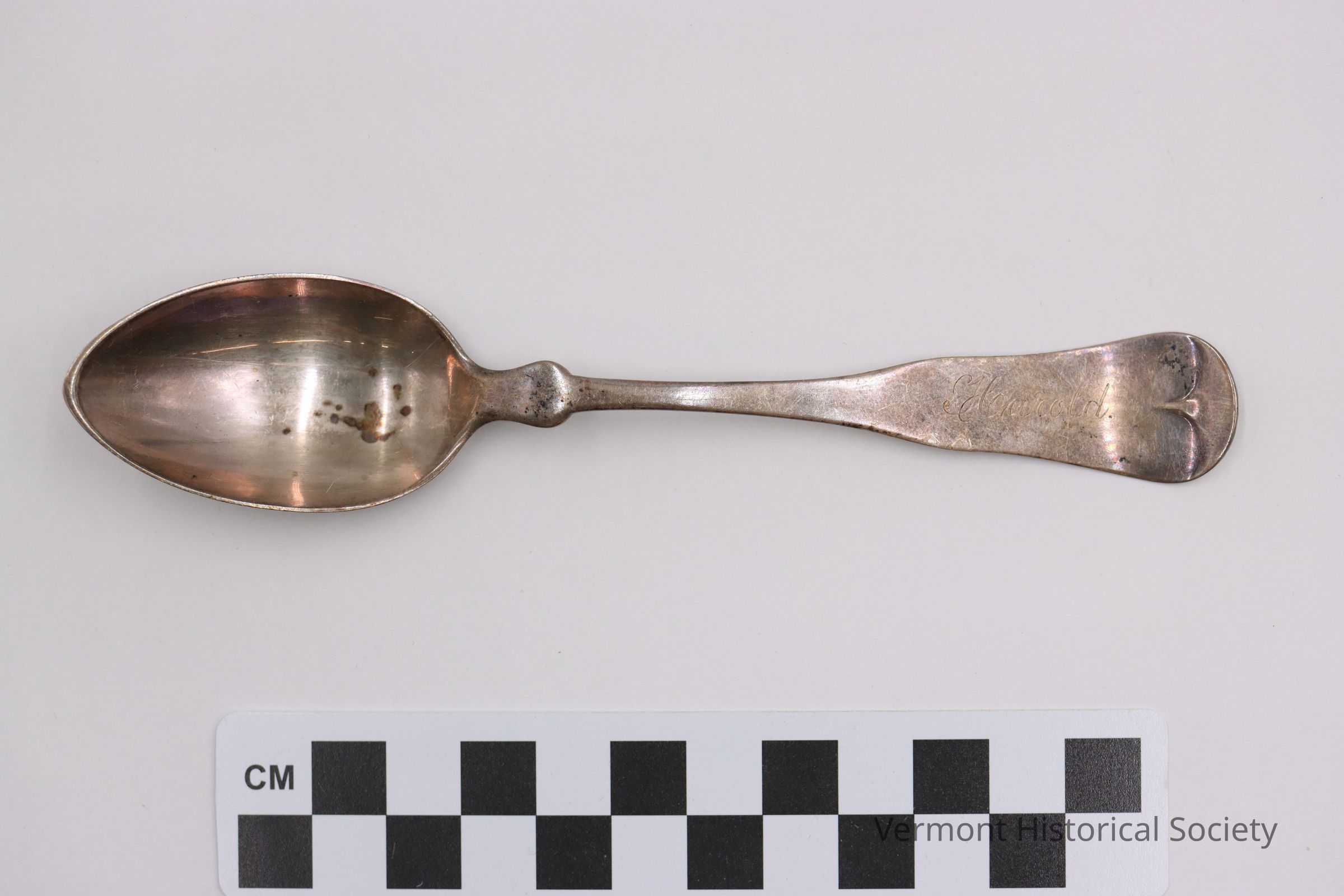 Silver teaspoon engraved with the word "Harold" on the handle. The back of the handle is marked "STERLING" and "BOGLE".