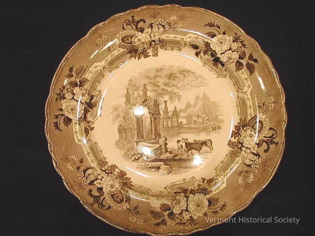 Brown and white transfer-printed dinner plate. The border has a repeated still life vignette of flowers and an urn. The center has a scenic design of gothic ruins and underfed cows. The reverse is marked, "Abbey Ruins, T. Mayer Longport".