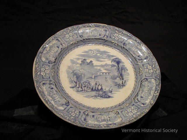 Blue and white transfer-printed dinner plate. The border is separated into cartouches, each showing a castle. The center shows figures by a river with a castle and bridge in the background. The reverse is marked, "T.J. & J. Mayer, Florentine", and impressed, "33".Acquisition
