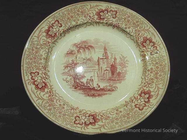 Red and white transfer-printed dinner plate. The border is flowers and feathers. The center shows a scene of three figures by a river with a castle on the opposite shore. The reverse is marked, "Non-pareil. T.& J. Mayer, Longport".Acquisition